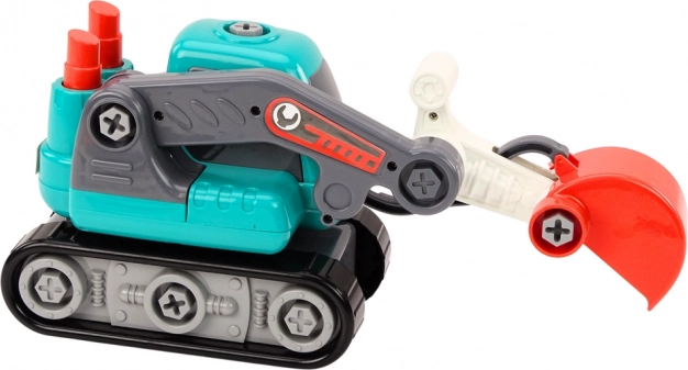 Koparka ma ruchome ramię i czerwoną łyżkę, realistyczne gąsienice oraz solidną konstrukcję z wysokiej jakości plastiku. W zestawie znajduje się dziecięca wiertarka (na baterie 3× AAA – nie są częścią zestawu) oraz inne narzędzia ułatwiające śrubowanie.