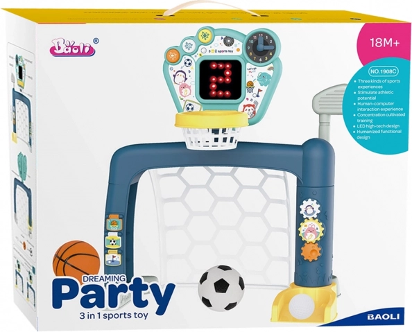Ten dziecięcy zestaw sportowy 3 w 1 zapewnia zabawę i rozwój umiejętności w jednym pakiecie. Dziecko może strzelać gole, rzucać do kosza lub wybijać piłeczki golfowe, jednocześnie trenując umiejętności ruchowe, koordynację ręka–oko oraz orientację przestrzenną. Interaktywny panel oferuje efekty świetlne, dźwięki i muzykę, które zachęcają do aktywnej zabawy i koncentracji.
