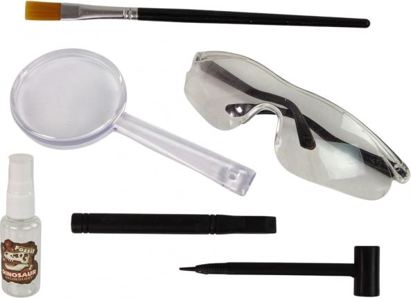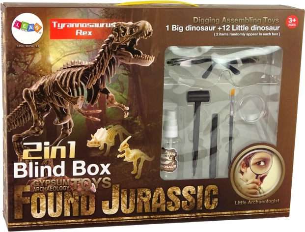 Narzędzia zawarte w zestawie pozwolą odkryć szkielet dużego dinozaura oraz dwóch mniejszych. Dwa bloki gipsowe i podwójna porcja zabawy. Dwa mniejsze szkielety pozostają tajemnicą – po oczyszczeniu kości akcesoria dołączone do zestawu pomogą ustalić, jaki dinozaur ukrywał się w skale.