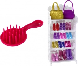 W tym zestawie znajdziesz także szafkę na buty, która zawiera 12 par kolorowych butów i dwie torebki - jedną fioletową i jedną złotą. Każde dziecko może z tym zestawem stworzyć różnorodne kolekcje mody dla lalki.