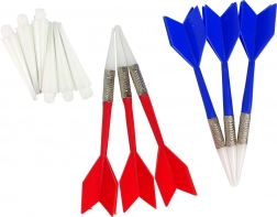 Zestaw zawiera rzutki z plastikowymi lotkami i metalicznymi uchwytami do precyzyjnego rzucania.