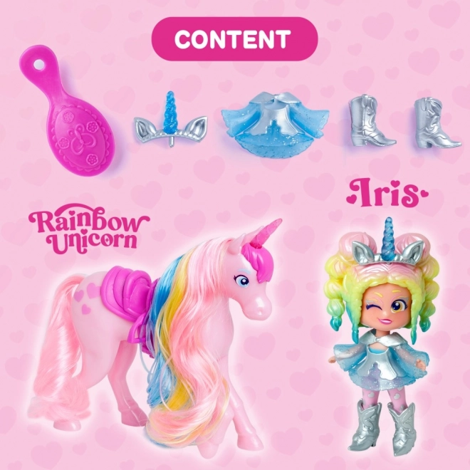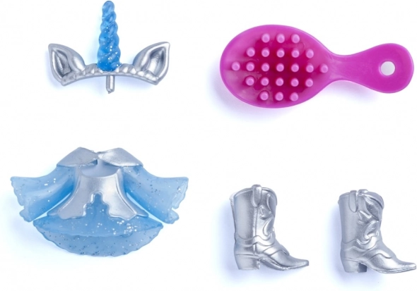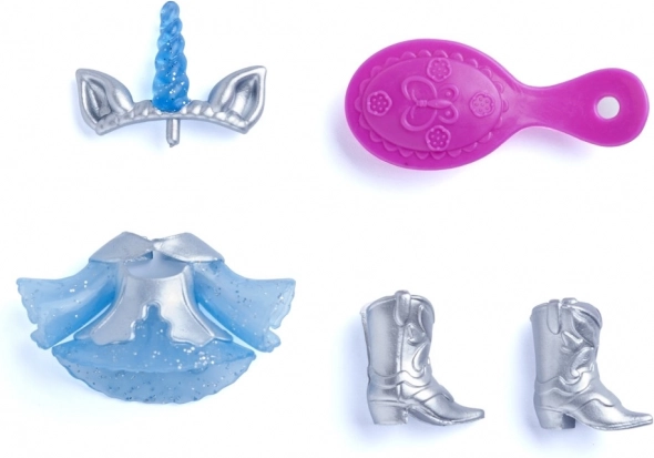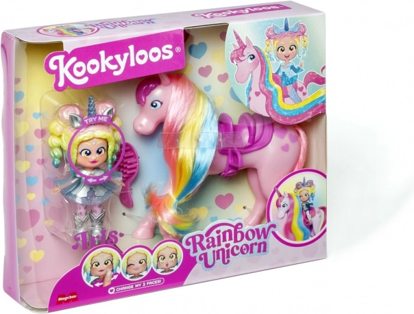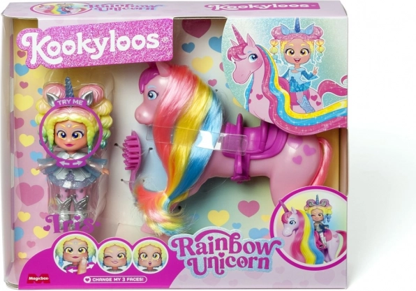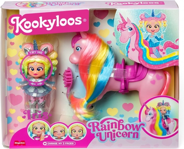Wierzysz w jednorożce? W świecie KookyLoos wszystko jest możliwe! Odkryj Aurorę i jej tęczowego jednorożca o imieniu Star, którego grzywa jest wykonana z prawdziwych włosów! Rozczesz ją szczotką i wypróbuj różne fryzury. Przygotuj się na tysiące przygód z KookyLoos! Pamiętaj, że każda KookyLoos ma własne akcesoria, które możesz łączyć i wymieniać z innymi KookyLoos, a ich miny zmienisz jednym kliknięciem. Zestaw zawiera: 1 lalkę, 1 jednorożca, 1 szczotkę, 1 strój.
