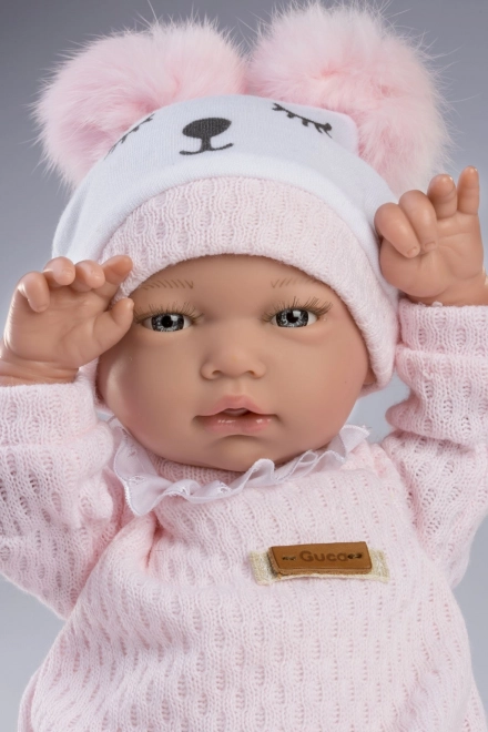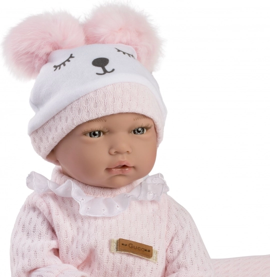 Lalka Guca Andrea jest jak prawdziwe niemowlę – ma miękkie materiałowe ciałko, przyjemnie się ją nosi, a po naciśnięciu na klatkę piersiową wydaje realistyczny dźwięk śmiejącego się dziecka. Ręce i nogi są osadzone na stawach, dzięki czemu lalka jest ruchoma i potrafi samodzielnie siedzieć. W zestawie znajduje się smoczek jako dekoracyjny dodatek, a całość jest stylowo zapakowana w pudełko prezentowe.