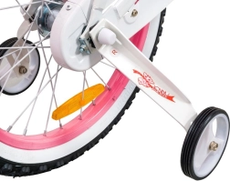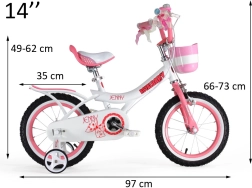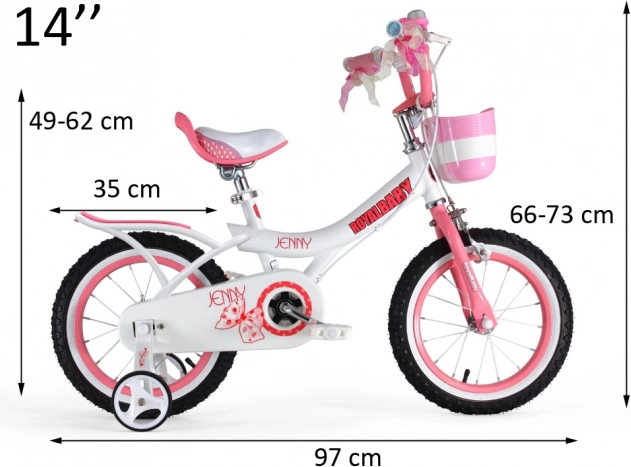 ROYALBABY Jenny 14'' to starannie zaprojektowany rower dziecięcy dla początkujących. Dzięki szeroko rozstawionym bocznym kółkom i tyczce prowadzącej pomaga budować równowagę i pewność w siodle. Wytrzymała stalowa rama, pompowane gumowe opony oraz ergonomicznie ukształtowane komponenty zapewniają komfort i stabilność przy każdej przejażdżce.