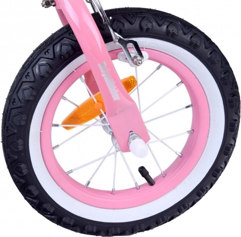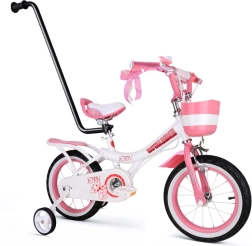Stylowy rower dziecięcy ROYALBABY Jenny z kołami 14'' jest idealny na pierwsze przejażdżki. Oferuje boczne kółka stabilizujące, praktyczną tyczkę prowadzącą dla rodziców, stalową ramę oraz pełną osłonę łańcucha dla bezpieczeństwa. Wygodne siodełko z uchwytem, hamulce ręczne dla małych dłoni oraz wyposażenie takie jak koszyk, dzwonek i odblaski zapewnią bezpieczną i stabilną jazdę dla dzieci od 3 lat.