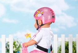 Kask zachwyca intensywnie różowym kolorem z brokatem i zabawnymi naklejkami – idealny na stylowe przejażdżki lalki BABY born.