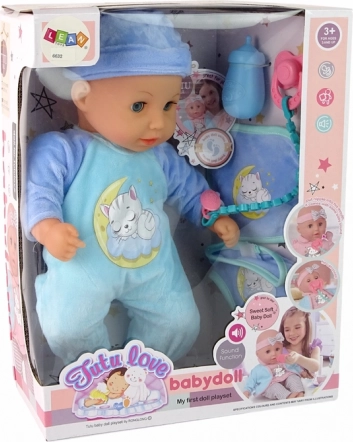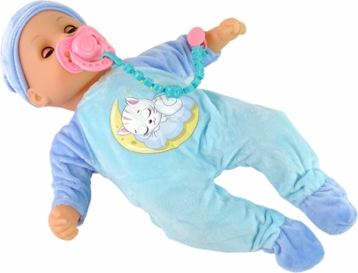 Urocza lalka niemowlę ubrana jest w ładną niebieską piżamę z motywem śpiącego kotka i ma czapeczkę na głowie. W zestawie znajduje się także różowy smoczek i butelka do picia. Akcesoria obejmują również śliniak i majteczki. Całość jest spójna i prezentuje się bardzo uroczo.