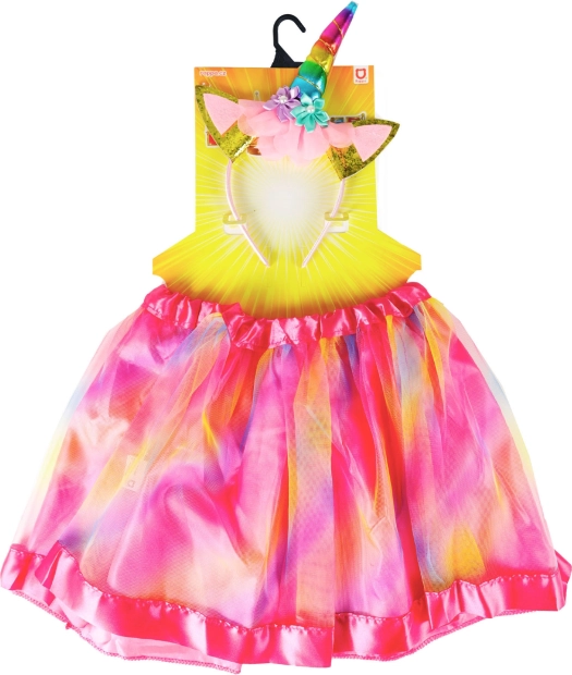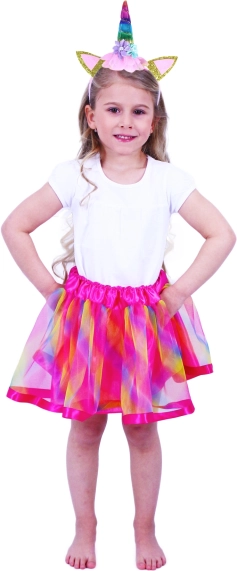 Magiczny kostium jednorożca dla dzieci, który obejmuje piękną tęczową spódnicę tutu oraz wspaniałą opaskę z rogiem jednorożca i kolorowymi różami. Ten oryginalny zestaw został zaprojektowany, aby pobudzać kreatywną zabawę i wyobraźnię. Z tym kostiumem Twoi mali marzyciele mogą przenieść się do świata magii i przygód!