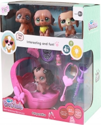 Ten uroczy zestaw zawiera cztery różne zabawki piesków, każdy z dużymi oczami i figlarnym wyrazem, które z pewnością oczarują każdego małego miłośnika zwierząt. Walizeczka, będąca częścią zestawu, nie tylko służy jako legowisko, ale także gra i miga czerwonym i niebieskim światłem, wspierając kreatywną zabawę.