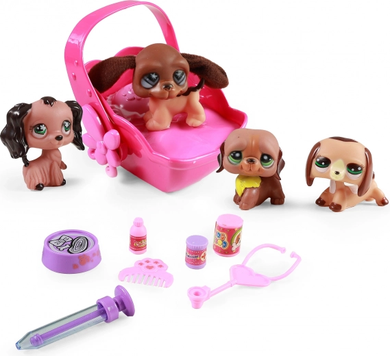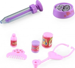 Zestaw zawiera różne narzędzia, takie jak strzykawka, grzebyk, stetoskop i inne, wszystkie w różnych kolorach. Idealne do symulacji opieki nad zwierzątkami.