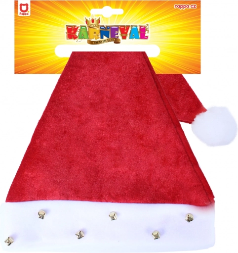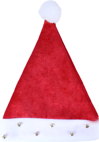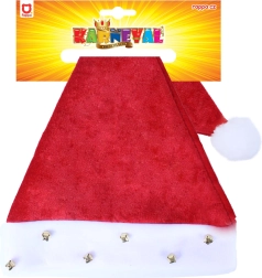 Stylowa świąteczna czapka z białym obszyciem, ozdobiona dzwoneczkami i pomponem. Idealna na świąteczne przyjęcia.