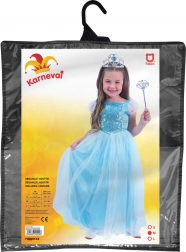 Uroczy dziewczęcy kostium dla małych księżniczek w niebieskim kolorze z białym tiulem i błyszczącymi cekinami na gorsecie. Idealny na karnawał, przyjęcia i bajkowe zabawy. Sukienka w rozmiarze M dla wieku 6–8 lat (116–128 cm) zachwyca delikatnym wyglądem i wygodnym krojem. Dzięki lekkim materiałom świetnie się nosi i podkreśla bajkowy wygląd, błyszczący efekt oraz wygodę noszenia.