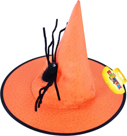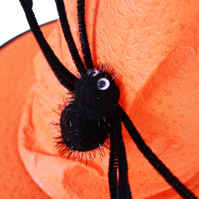 Stylowy pomarańczowy kapelusz czarownicy z czarną lamówką i wyrazistym pająkiem to idealny dodatek na Halloween. Nada Twojemu kostiumowi autentyczny i wyrazisty wygląd, świetnie sprawdzi się na imprezy, wydarzenia tematyczne i przebrania.