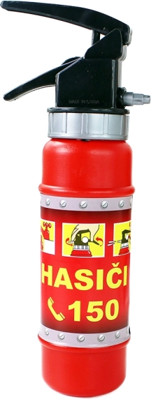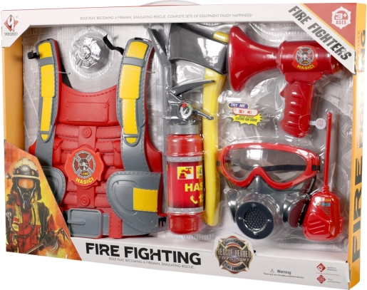 - Gaśnica (napełniana wodą), kamizelka, odznaka strażaka, krótkofalówka (imitacja), siekiera (zabawka), łom (zabawka), ochronna maska na twarz (zabawka), megafon