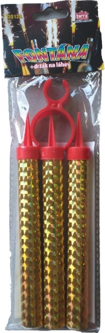 Ciesz się niezapomnianym przyjęciem ze złotą fontanną na butelkę! Opakowanie zawiera trzy fontanny o długości 12 cm. Doskonały zamiennik świeczek na torcie, który przynosi magiczny efekt zimnych ogni. Wystarczy wbić w tort lub umieścić na szyjce butelki za pomocą uchwytu.