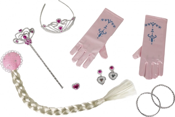 - Korona, kolczyki, pierścionki, magiczna różdżka, bransoletki, rękawiczki, długi blond warkocz