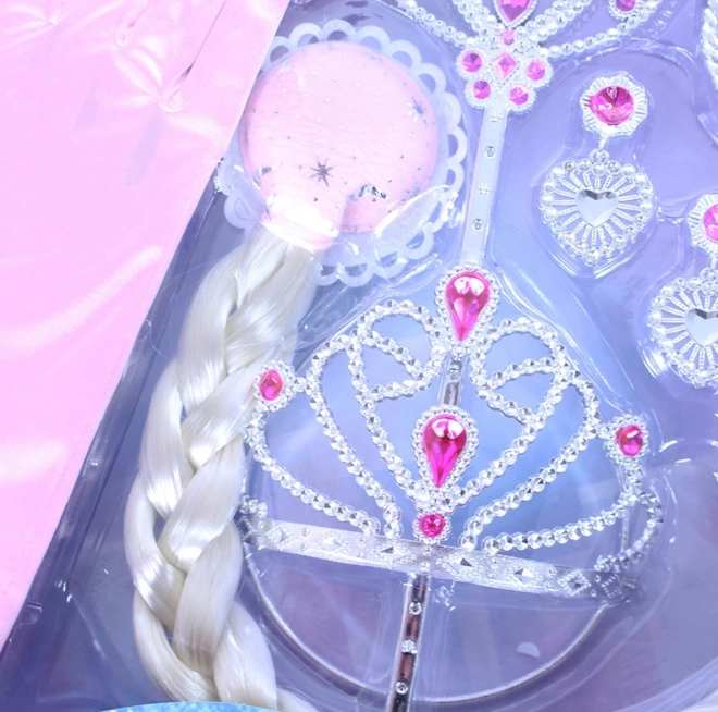 Zamień codzienną zabawę w baśń. Ten zestaw księżniczki z eleganckim różowym zdobieniem i długim blond warkoczem rozświetli każdy kostium i doda małym strojnisiom pewności siebie oraz czarującego wyglądu.