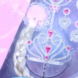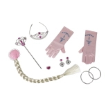 - W zestawie znajdziesz: koronę, kolczyki, pierścionki, magiczną różdżkę, bransoletki, rękawiczki oraz długi blond warkocz