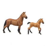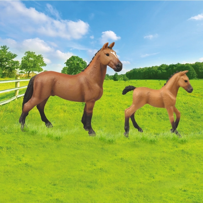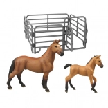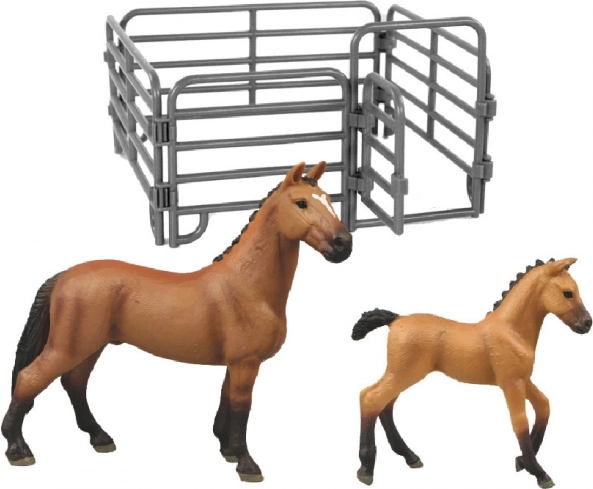 Idealny zestaw dla miłośników koni zawiera figurkę konia i źrebięcia w imponującym brązowym kolorze z białą plamą, uzupełnioną o zagrodę.