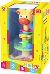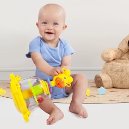 Kolorowa karuzela w kształcie żyrafy zachwyci nawet najmłodszych: po naciśnięciu głowy kolorowe kuleczki zaczynają się kręcić, podskakiwać i wydawać grzechoczący dźwięk. Proste sterowanie mechaniczne bez baterii wspiera rozwój małej motoryki oraz koordynację oko–ręka.