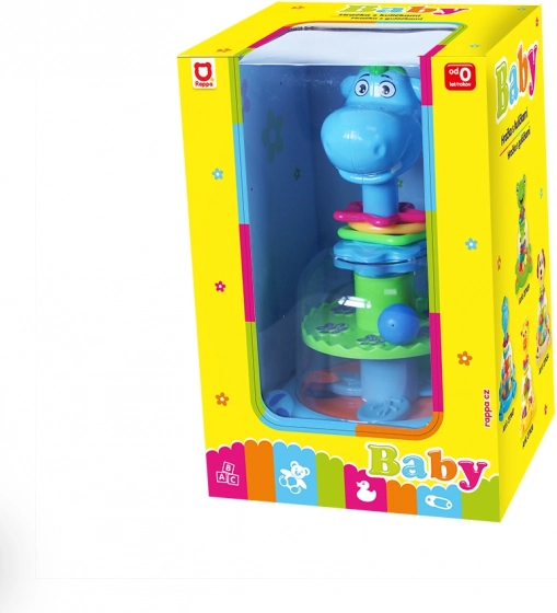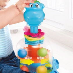 Kolorowa zabawka w kształcie dinozaura, która po naciśnięciu głowy wprawia w ruch kolorowe kuleczki – te wirują, podskakują i wydają grzechoczący dźwięk. Świetna zabawa dla najmłodszych dzieci.
