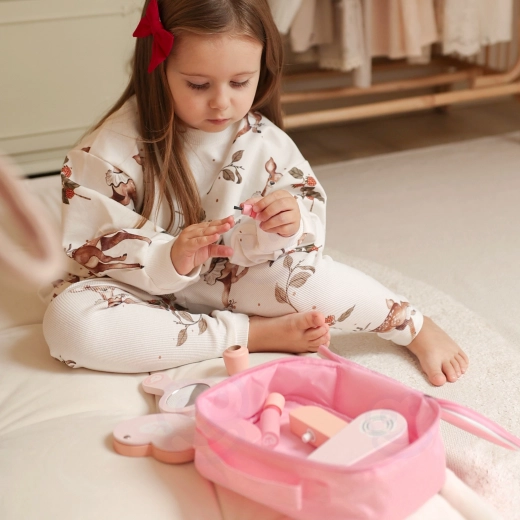 Ten dziecięcy zestaw kosmetyczny w uroczej różowej kosmetyczce oferuje aż 12 starannie wykonanych drewnianych akcesoriów. Dzieci mogą się „malować”, czesać i „suszyć” włosy, naśladując dorosłych w sposób całkowicie bezpieczny i pełen fantazji. Dzięki kompaktowym wymiarom zestaw jest idealny do domu i w podróż.
