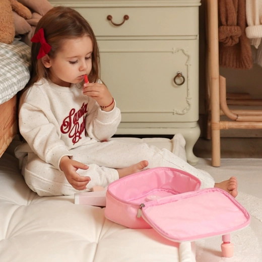 Praktyczna kosmetyczka utrzymuje wszystkie akcesoria w jednym miejscu. Dzieci łatwo zabiorą ją wszędzie i mają wszystko gotowe do zabawy.