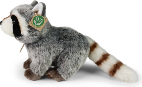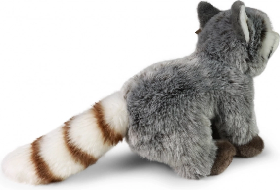 Pluszowy szop ma szczegółowe elementy, w tym paskowany ogon i kontrastowe wzory futra, podkreślające jego realistyczny wygląd.