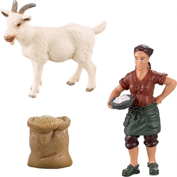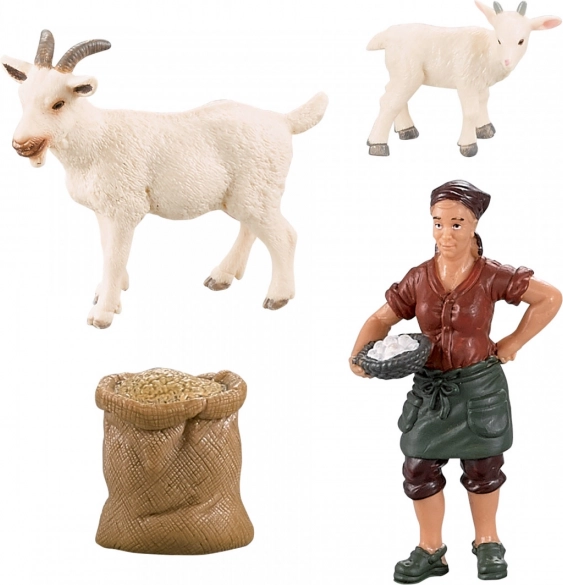 Koza, koźlę i farmerka tworzą harmonijny komplet, idealny do tworzenia scenek z farmy i nauki o hodowli zwierząt.