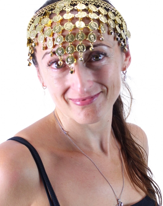 Ta stylowa orientalna opaska została zaprojektowana tak, aby podkreślić rysy twarzy i nadać kostiumowi wyrazisty, a przy tym gustowny efekt. Złote monetki delikatnie drżą podczas tańca, tworząc atrakcyjny dźwięk i połysk.