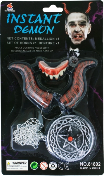 Ten kompletny zestaw diabelskich dodatków odmieni każdy strój w mgnieniu oka. Wygodne rogi na gumce trzymają się znakomicie, wyrazisty naszyjnik z pentagramem dopełni mistyczny look, a realistyczne wampirze zęby dodadzą kostiumowi mrocznego błysku.