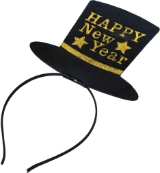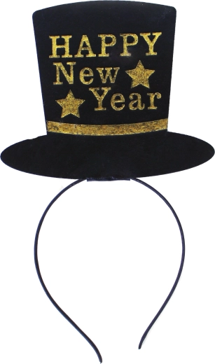 Czarna opaska z kapelusikiem, uzupełniona złotym napisem HAPPY New Year, to świetny dodatek na świętowanie lub imprezę podczas powitania Nowego Roku!