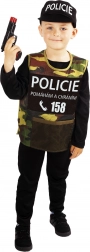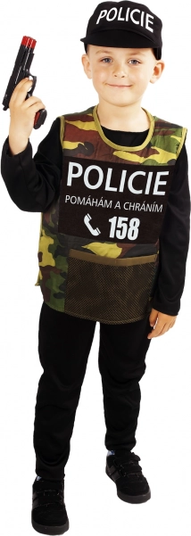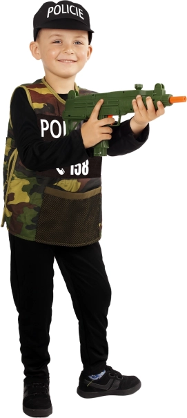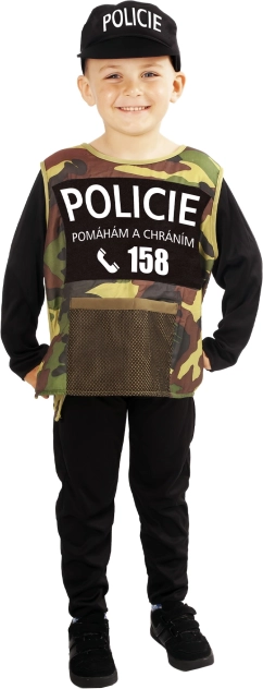- Zawartość opakowania: czarny kombinezon, taktyczna kamizelka moro z napisem POLICIE, czapka