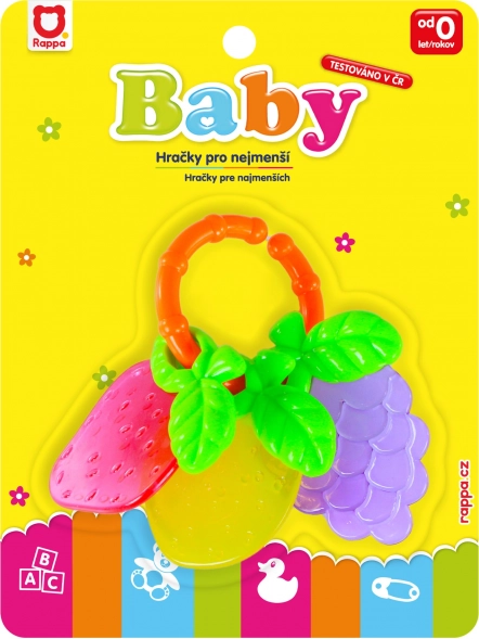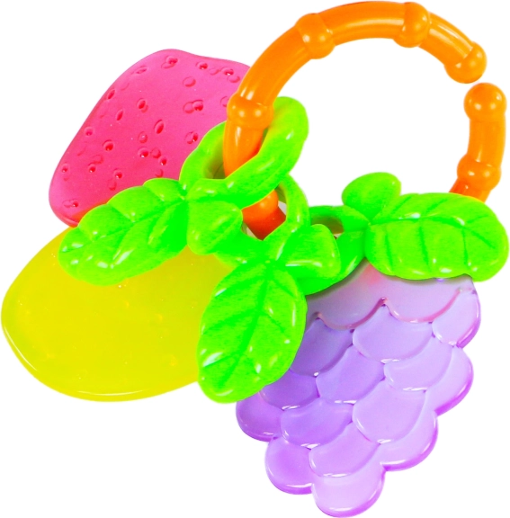 Wesoła grzechotka/gryzak z owocowymi motywami przyciąga uwagę dzieci żywymi kolorami i przyjemną fakturą, która masuje dziąsła i pomaga przy ząbkowaniu. Praktyczny kształt wspiera naturalny chwyt i rozwój małej motoryki.
