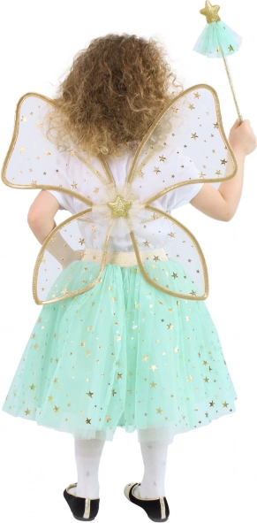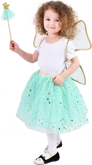 Kostium zawiera przepiękną zieloną spódniczkę ze złotymi gwiazdkami, uzupełnioną dopasowanymi skrzydłami i różdżką, dla doskonałego bajkowego doświadczenia.