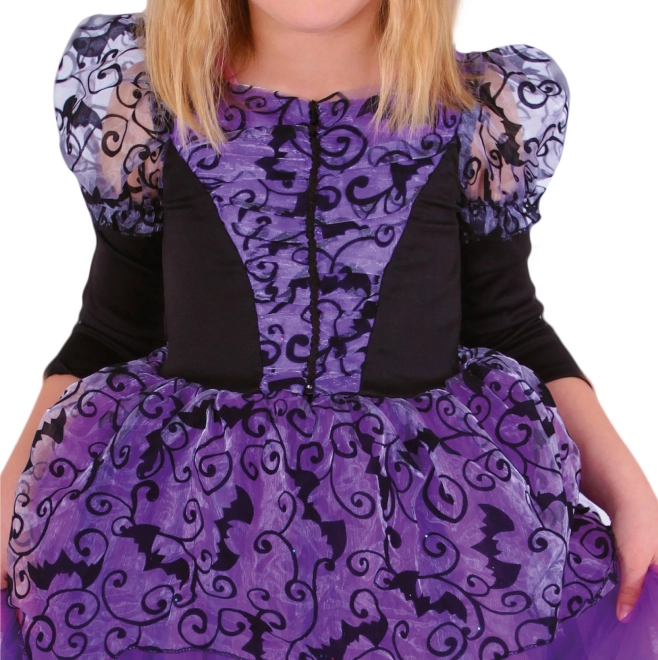 Fioletowo-czarna sukienka z motywem nietoperzy i puszystą spódnicą nadaje kostiumowi autentyczny wygląd.