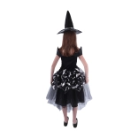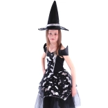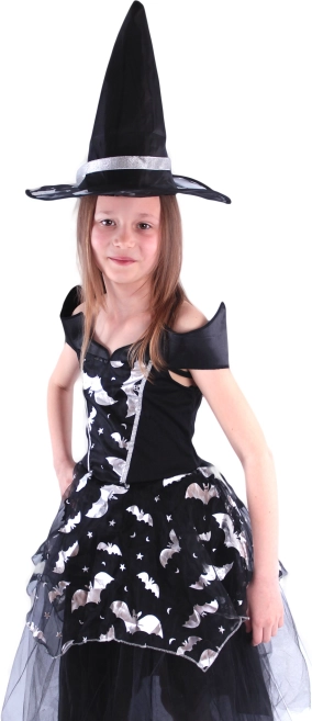 Ten piękny kostium czarownicy z motywami nietoperzy to idealny wybór dla dziewczynek w wieku 6–8 lat o wzroście 117–128 cm. Czarna sukienka z puszystą spódnicą ozdobiona jest srebrnymi elementami, a doskonale dopasowany kapelusz z elegancką srebrną wstążką dopełnia cały wygląd.