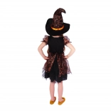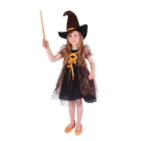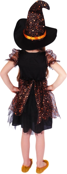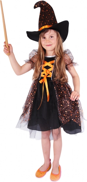 Kostium obejmuje czarną sukienkę z puszystą spódnicą zdobioną pomarańczowymi elementami oraz satynową wstążką, które nadają magiczny wygląd.