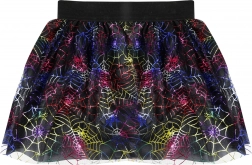 Odmień przebranie w mgnieniu oka – czarna spódniczka z lekkim tiulem z nadrukiem kolorowych pajęczyn doda każdej stylizacji magicznego charakteru. Materiał jest przewiewny, przyjemny w noszeniu i pięknie faluje w ruchu.