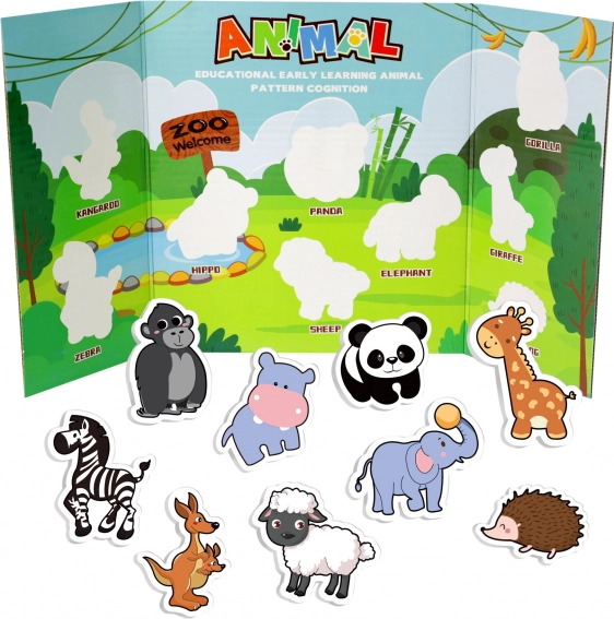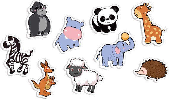- Kompletny zestaw: podkładka, 9 piankowych wyciętych kształtów zwierząt, 9 naklejek oraz odpowiednia liczba magnesów.