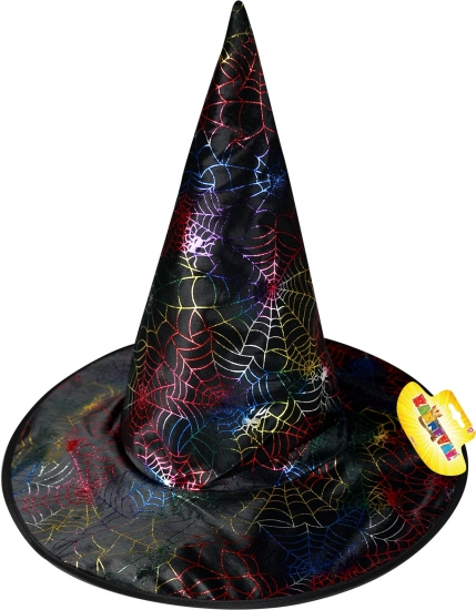 Uzupełnij swój kostium o czarny kapelusz czarownicy z kolorowym nadrukiem pajęczyn, zaprojektowany dla dorosłych. Lekka tkanina i uniwersalny rozmiar zapewniają wygodę noszenia na Halloween, karnawał i imprezy tematyczne.