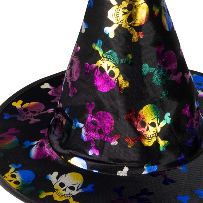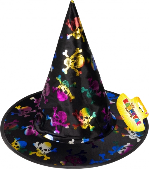 Stwórz niezapomniany kostium dzięki temu czarnemu kapeluszowi z motywem kolorowych czaszek. Doskonały do przebrania czarodziejskiego i halloweenowego, łatwo łączy się z peleryną, sukienką lub maską. Dzięki dziecięcemu rozmiarowi świetnie leży i podkreśli każdą straszną lub baśniową przemianę.