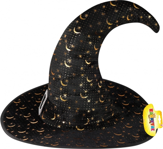 Stwórz idealny czarodziejski kostium z tym eleganckim kapeluszem w klasycznej czerni. Szerokie rondo i spiczasty kształt nadają autentyczny wygląd, a złote gwiazdy i półksiężyce pięknie się mienią, podkreślając mistyczny klimat. Ozdobna klamra u podstawy stożka dodaje całości szyku.