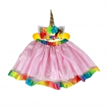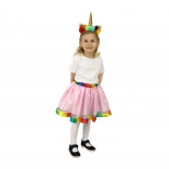 Rewelacyjny dziewczęcy kostium jednorożca dla małych księżniczek! Ten magiczny zestaw zawiera różową tiulową spódniczkę tutu z tęczową, satynową lamówką oraz opaskę ze złotym rogiem i kwiatami.