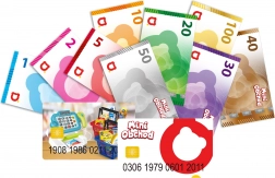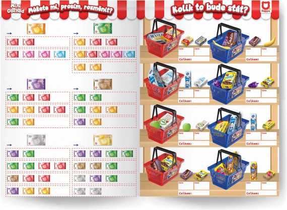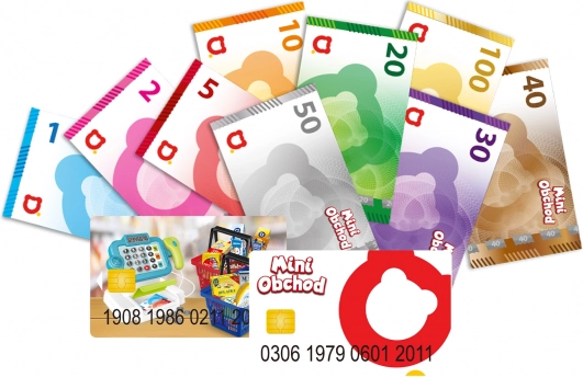 Zawiera wzory banknotów, monet, kart płatniczych i inne materiały wspomagające naukę przez zabawę.