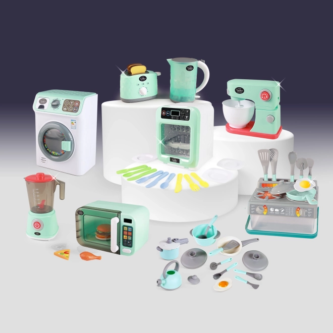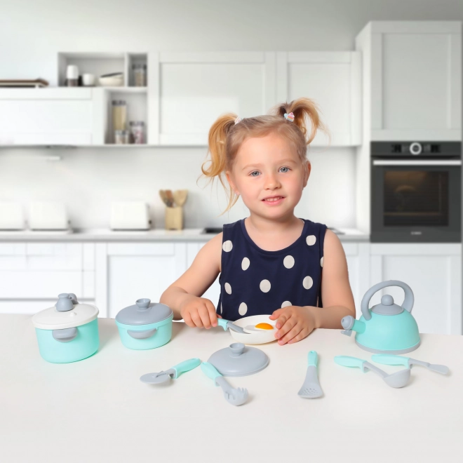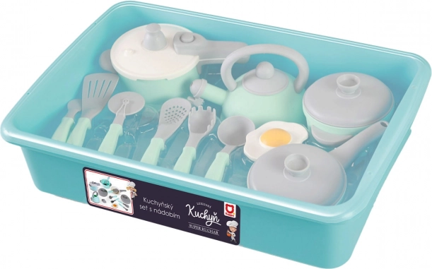 Duży zestaw kuchenny, w którym znajdziesz mnóstwo przydatnych akcesoriów do kuchni! Nie może zabraknąć na przykład czajnika, garnka, patelni, szybkowaru, chochli i wielu innych elementów wyposażenia kuchennego. Wszystko dodatkowo schowane w praktycznym pudełku. Wykonane z plastiku.