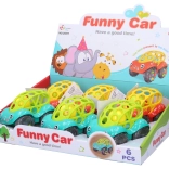 Uroczy plastikowy samochodzik–grzechotka dla najmłodszych zachwyca wesołymi kolorami, lekką konstrukcją oraz przyjemnym, grzechoczącym dźwiękiem, który uspokaja maluszka i wspiera jego rozwój sensoryczny.