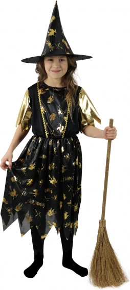 Podaruj małej czarodziejce strój, który wyróżni się na każdej imprezie. Czarna sukienka ze złotymi halloweenowymi wzorami, rękawami o metalicznym efekcie oraz efektownie postrzępioną krawędzią gwarantuje magiczny wygląd bez kompromisów w komforcie.