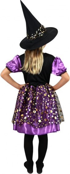 Podaruj swojej małej czarownicy niezapomniane wrażenia dzięki kostiumowi, który zachwyca od pierwszego spojrzenia. Fioletowo‑czarna sukienka ze złotym nadrukiem i bufiastymi rękawami pięknie prezentuje się na każdej imprezie. W zestawie znajduje się stylowy kapelusz czarownicy, który idealnie dopełnia cały strój.