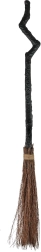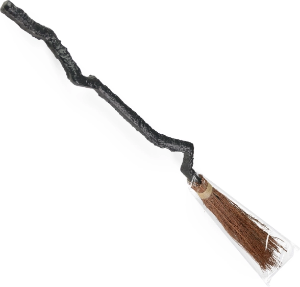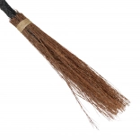 Miotła z czarną rączką i brązową częścią do zamiatania przypomina klasyczny rekwizyt czarodziejski.
